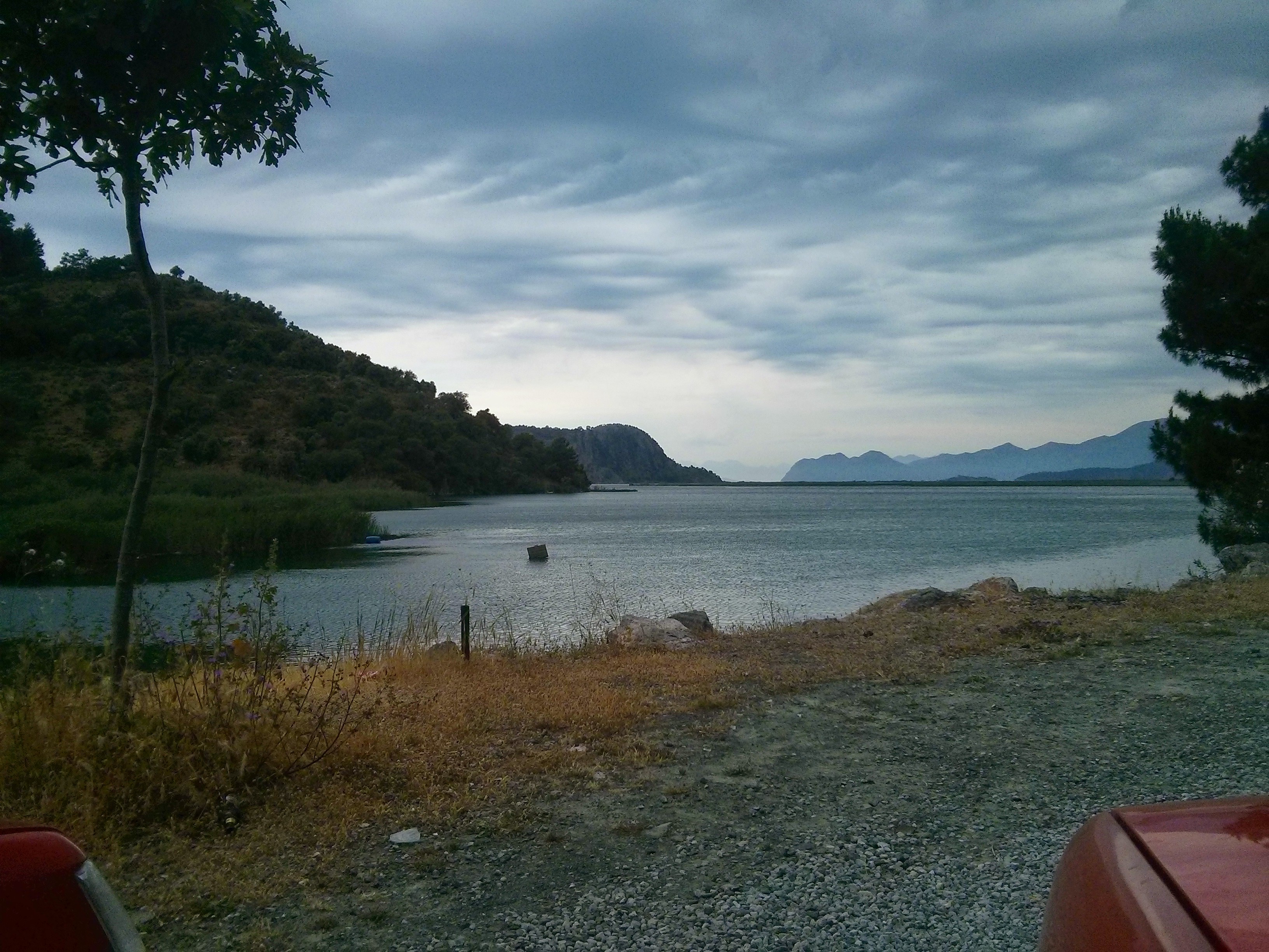 Pokręciliśmy się trochę po mieście zanim Gadowi udało się zlokalizować camping. Co prawda nie w mieście ale za to nad brzegiem jeziora. Jakieś 7km w stronę morza. Dosyć sprawnie dotarliśmy pod wskazany adres, potwierdziliśmy chęci przenocowania tam w namiotach, oglądnęliśmy piękny czerwony samochód na białych oponach (ktoś ma fotkę?), część osób została tam na obiedzie a reszta udała się na plażę. Bananowiec zwietrzył szansę na frajdę z jazdy i pocisnął przodem. Dodał gazu i wyrżnął kołem w ogromną dziurę za zakrętem.