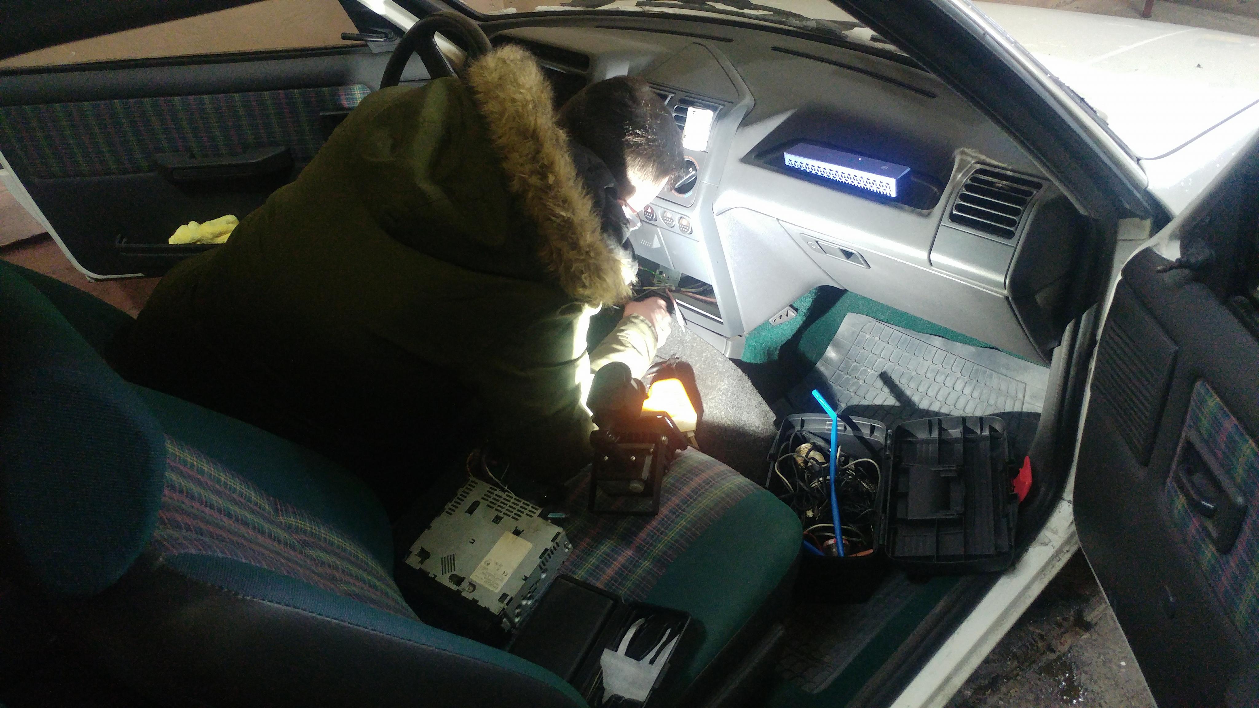 Zielona jest tylna półka, za to ma dwie urocze dziury po głośnikach. A'propos sprzętu audio - został wytargany. Kable poplątane i pourywane, w bagażniku resztki przewodów głośnikowych.
