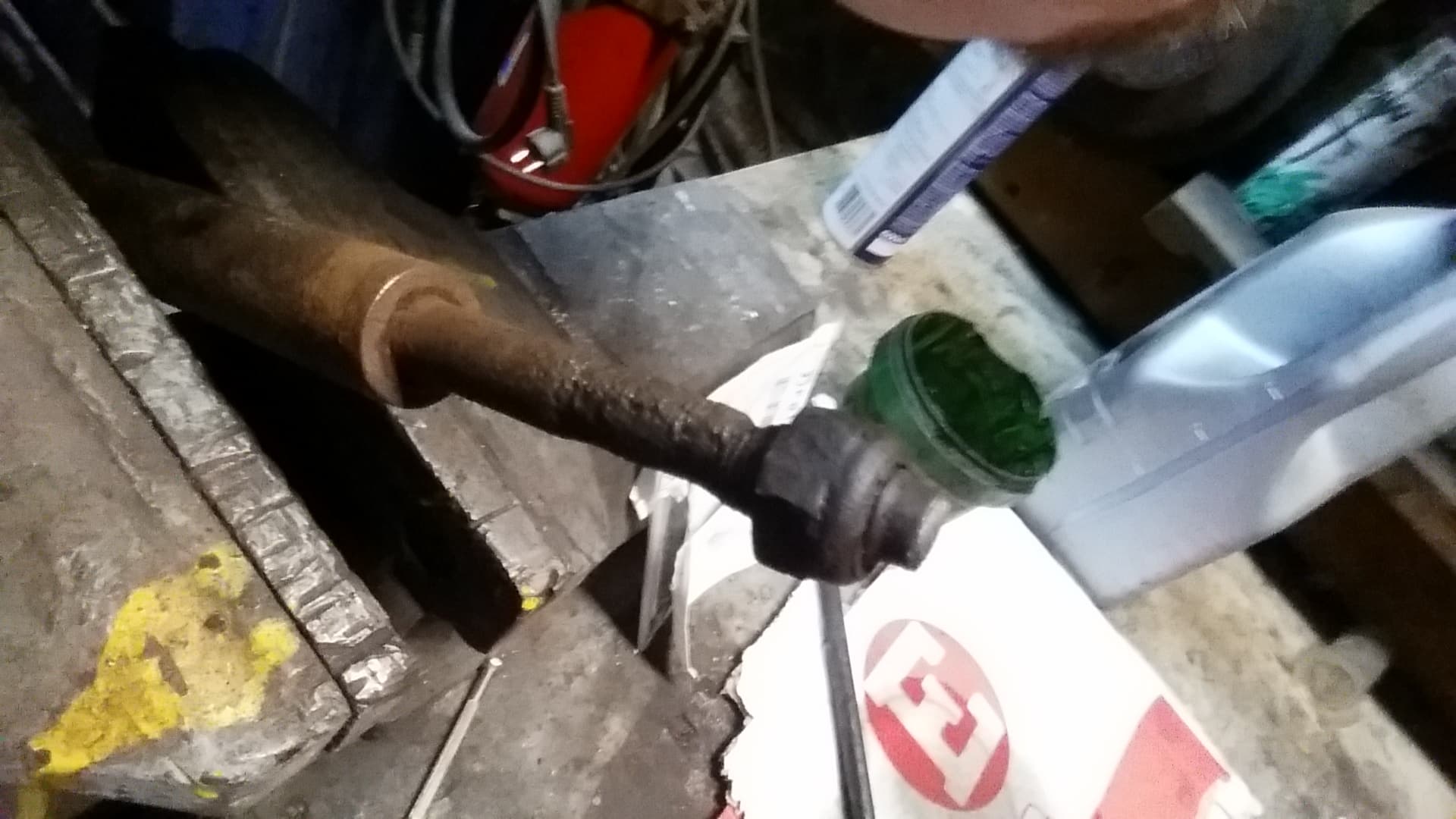 Lewa strona poszła elegancko. Przy okazji zmieniłem wahacz, bo sworzeń zwrotnicy był miękki, jak... No, w każdym razie nie powinien taki być. A na półce leżał lepszy. To wskoczył na miejsce starego. Yolo.
