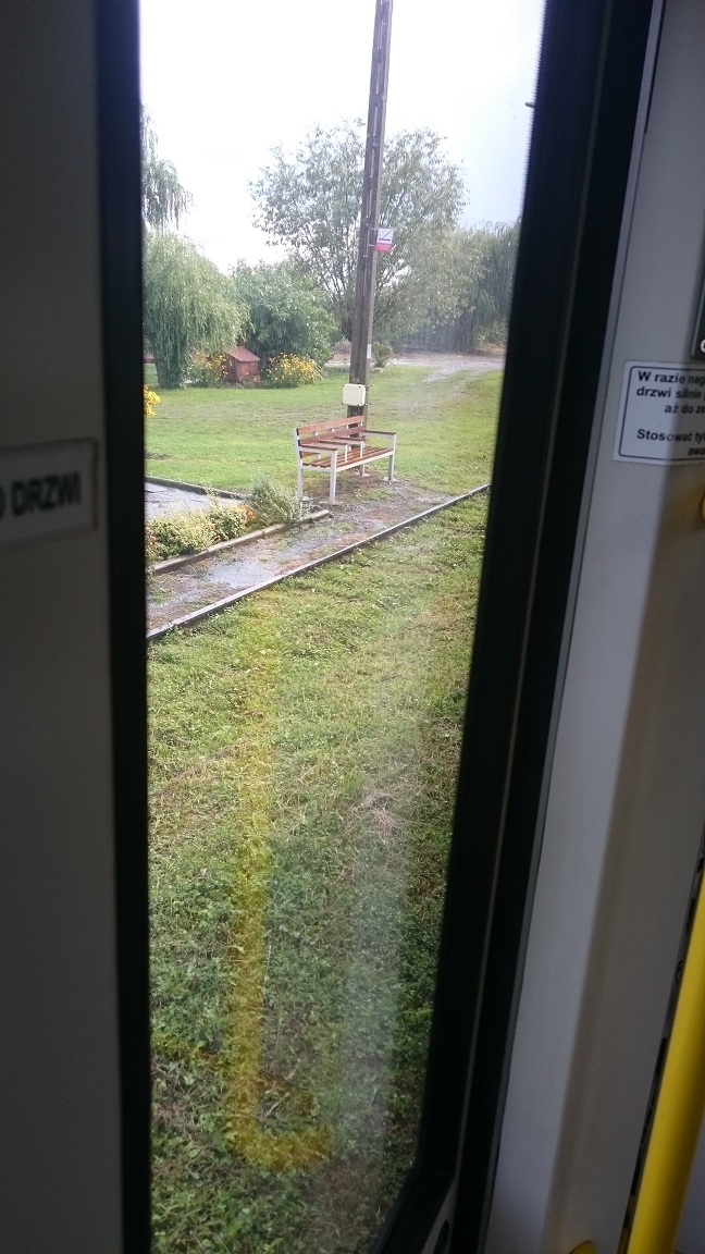Wszystko pożywne, choć pewnie niezdrowe i nie licząc paskudnej skóry, w którą owinięta jest kiełbasa, całkiem smaczne. Mówię sobie, że długa droga przede mną, że trzeba się posilić, trzeba zjeść też mięsko. Rozwijam je więc, próbuję jeść obdarte, odpycham widelcem skórę w róg talerza, oddalam od siebie ale to nie pomaga, przyprawia o torsje, odbiera apetyt. Zostawiam więc kiełbasę, odpuszczam, zadowalam się jajkiem, wypijam zupę, najadam się. Za oknem Rzeszów, Łańcut, Przeworsk, Jarosław i z każdą kolejną stacją przybywa chmur, które kłębią się, wypiętrzają, sinieją od spodu. Ula pisze do mnie, że sprawdziła rozkład, że mam wciąż kilkanaście minut, że odjeżdżam z peronu pierwszego, że to będzie pociąg do Horyńca-Zdroju. Ależ egzotyczna nazwa! - zachwycam się na samą wzmiankę - Chcę tam kiedyś jechać, chcę zobaczyć fragment kraju tak oryginalnie nazwany, snuję plany. Wracam na moje miejsce. Widzę, że wagon opustoszał ale nie o mojego współpasażera, który wciąż zasiada. Przepraszam go ponownie a on sięga po torbę, którą usadził już na moim miejscu, myśląc pewnie, że wysiadłem, że jechałem doinąd. Przechodzę nad jego nogami, susa daję nad torbą a on wstaje i usadawia się w innym rzędzie, nie chce dzielić przestrzeni. Wprawia mnie tym samym w zakłopotanie bo przecież sam mogłem siąść gdzie indziej, nie kłopotać go w pustym wagonie, nie trzymać się przydziału. Zapowiadają stację Jarosław, przypominają o wzięciu bagażu, przepraszają za opóźnienie. Bez skruchy w głosie, bez wyrzutów sumienia, przyzwyczajeni. Na porządku dziennym to wszystko i nikogo nie dziwi. Zerkam na wyświetlacz, który wciąż pokazuje 32 stopnie, konfrontuję z zzaokniem, gdzie szaro i buro i myślę że się zaciął, że to już nie aktualne. Jakaś osoba naciska guzik, zeźlona że nie działa, że nie otwiera. Zielony on i zielona ona. Przyciskając, wchodząc w interakcję czerwienieją na moment oboje. Ona szarpie drzwi, które wydają się by zacięte by po chwili same się otworzyć, przepuścić, trzasnąć na nowo. Ściągam rower z wieszaka, ustawiam się, pociąg hamuje, wypuszcza, wychodzę.