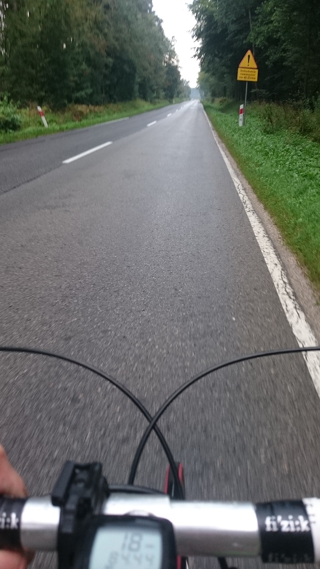 Droga jest równa, sucha i chociaż nie ma pobocza to przy tak niewielkim ruchu nie jest to coś, czym warto zaprzątać sobie głowę. Oglądam się za siebie i widząc, że nikogo tam nie ma, że pusto jest aż po sam horyzont, zjeżdżam na środek drogi, przyspieszam, czuję zapach mokrej trawy, mokrego pola i lasu, w uszach słyszę wiatr i szum kręcących się opon. Po lewej bociek, na czerwonej nodze stoi w trawie, po prawej, w oddali traktor jadący po polu. Aż chce się wyprostować, puścić kierownicę, zamknąć oczy i rozkładając ręce na boki wykrzyczeć jak fajnie jest być, żyć, jechać