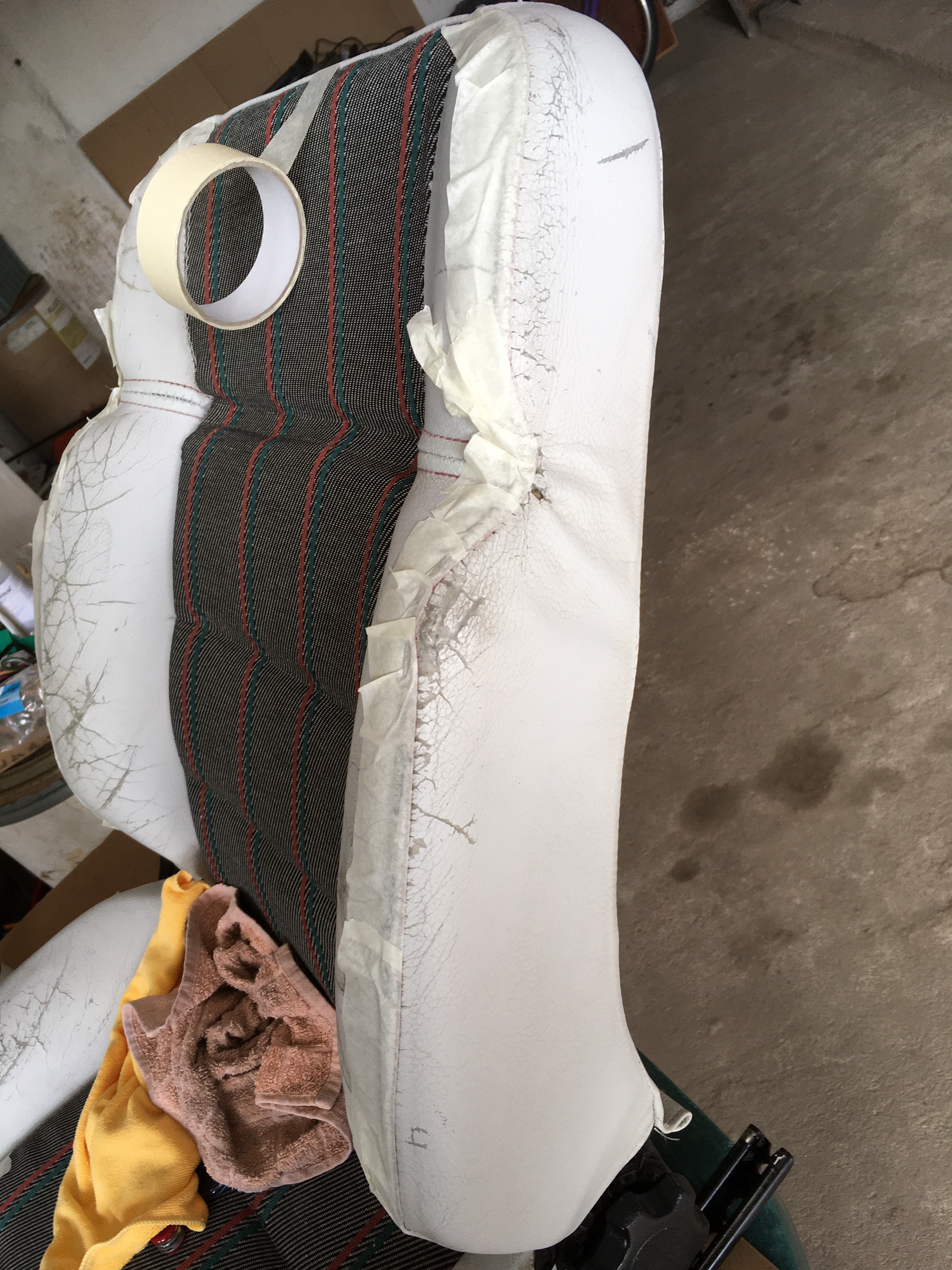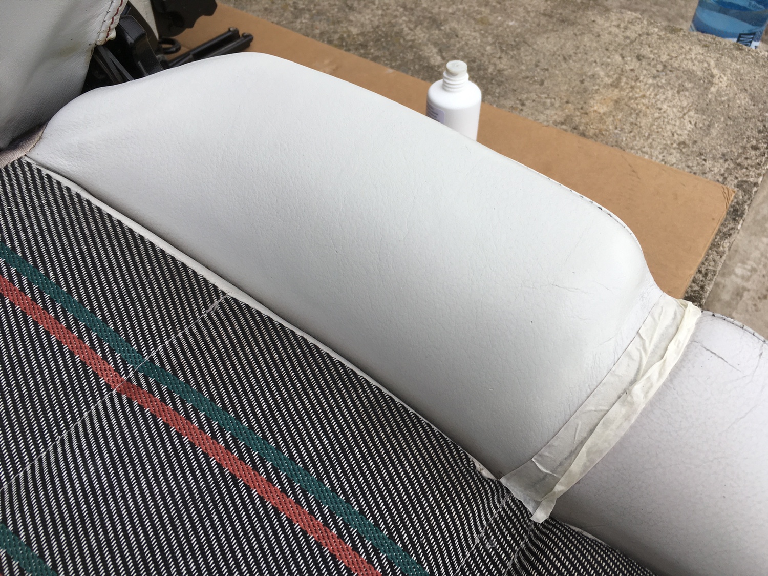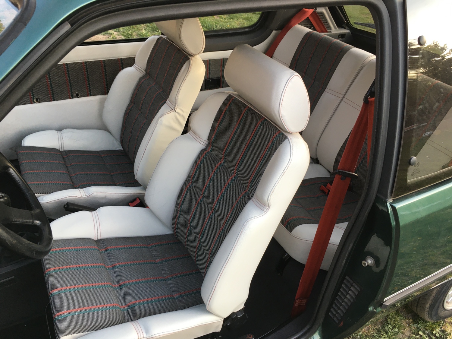 Fotele zostały pomalowane środkami od Colourlock: Plan był taki aby jak najmniejszymi kosztami przywrócić fotele do dobrej kondycji. Fotel pasażera był w dobrym stanie, fotel kierowcy w gorszym. Szukałem przez 3 miesiące czegoś w lepszym stanie, ale finalnie się poddałem i pozszywałem to co mam.