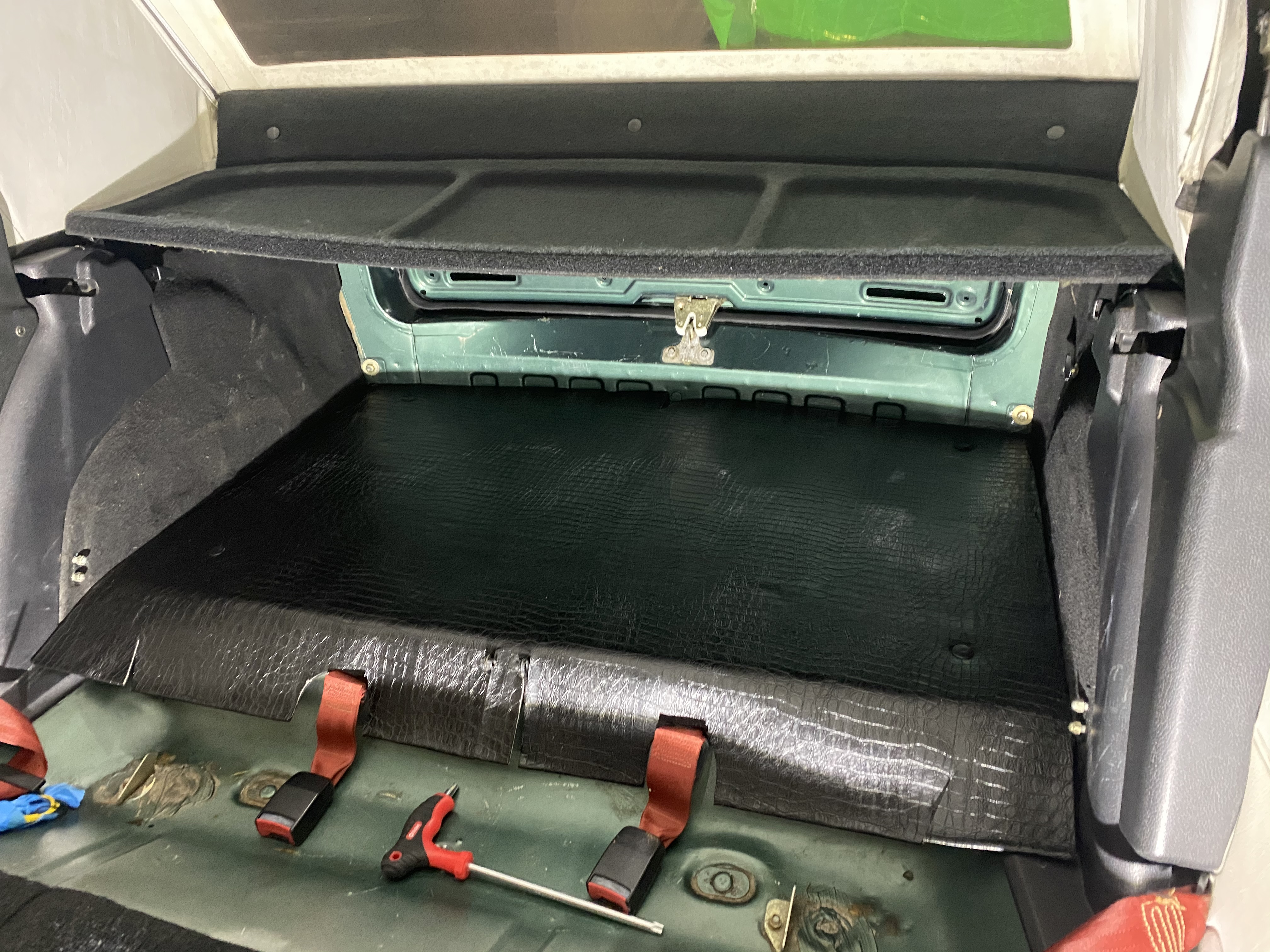 3. Wnętrze właśnie się „szyje”, wykładzina podłogi wyprana, wykładzina bagażnika obita czarna skórą z plastikowej świni