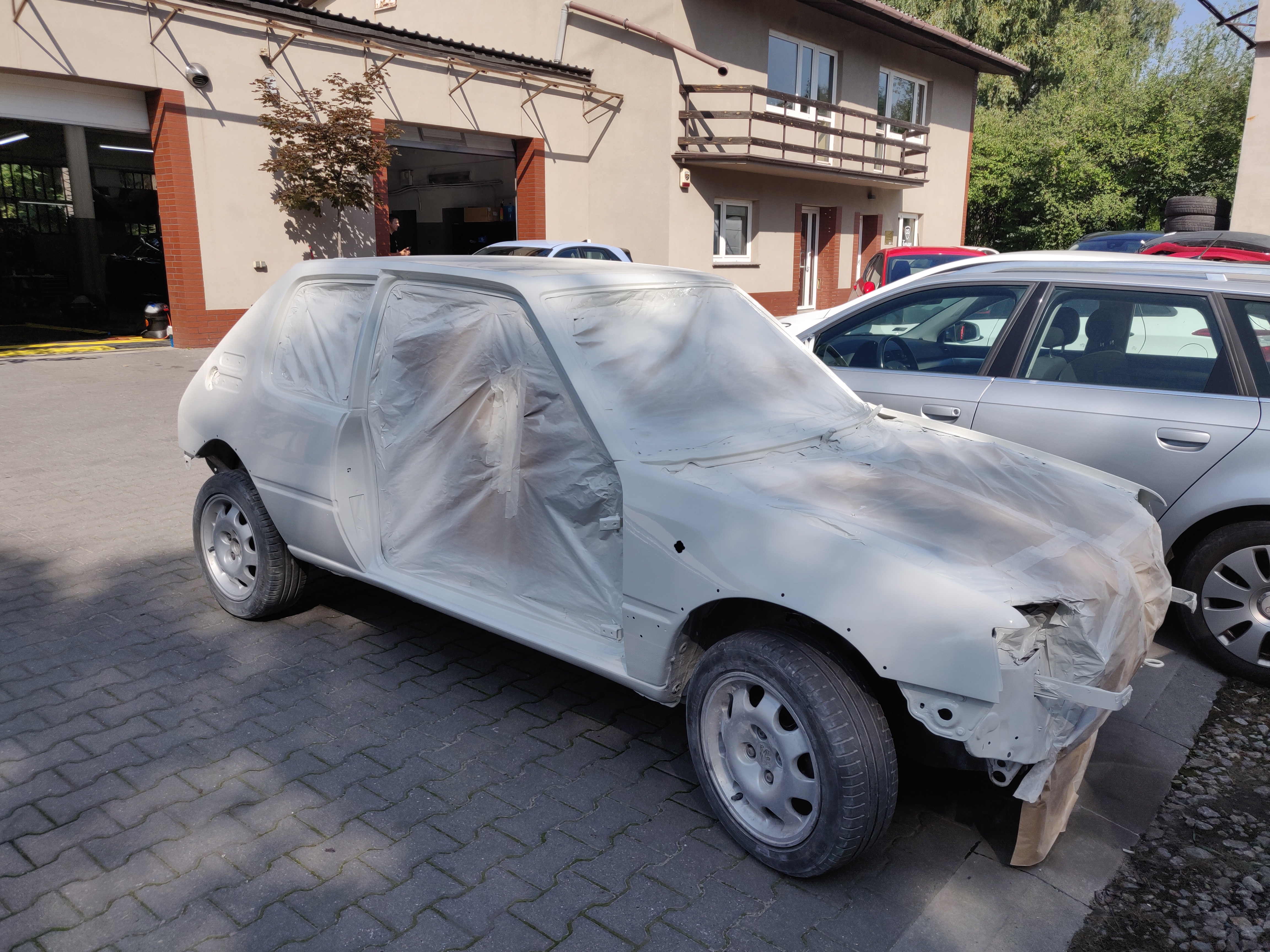 Po długim czasie oczekiwania na termin, udało się w końcu odstawić 205 do warsztatu lakierniczo-blacharskiego. Samochód doczekał się rozpoczęcia prac w zacnym towarzystwie m.in. Lamborghini.