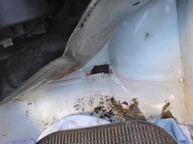 Wyszedł na jaw inny szczegół - nad stopami pasażera , pod tym piankowo-gumowym wygłuszeniem idzie łączenie blach ... zapaćkane czymś ala-kitowatym... tam był wprost kopiec powstały od korozji.