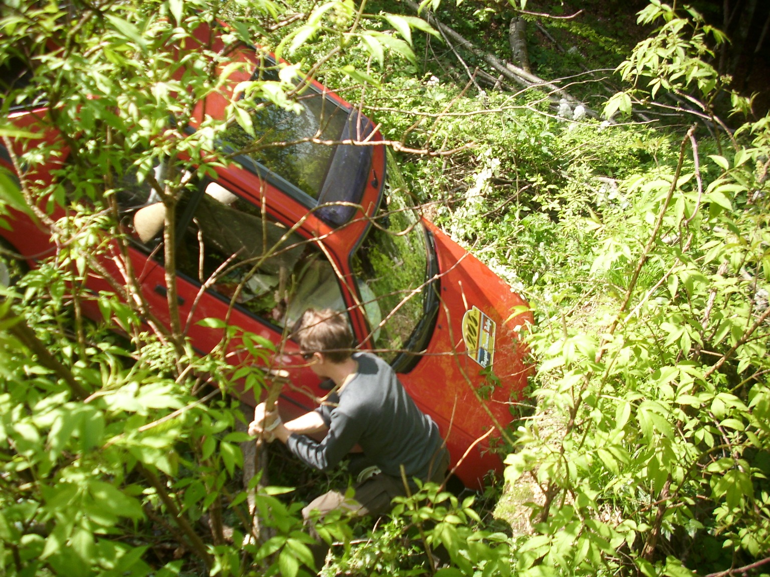 Gad wyposażył mnie w siekierę i skierował do rąbania pnia, na którym leżało auto. Generalnie takich pni po drodze było więcej (a podłogę mam do prostowania 8)7 ). Korzystając, że nie patrzę, do spółki z Emilem wykręcił zderzak razem z dokładką, a dalej wybebeszył butlę z gazem. Wszystkie te fanty powędrowały w górę na linkach holowniczych, bo przy takim pochyleniu stoku nie było innego rozwiązania.