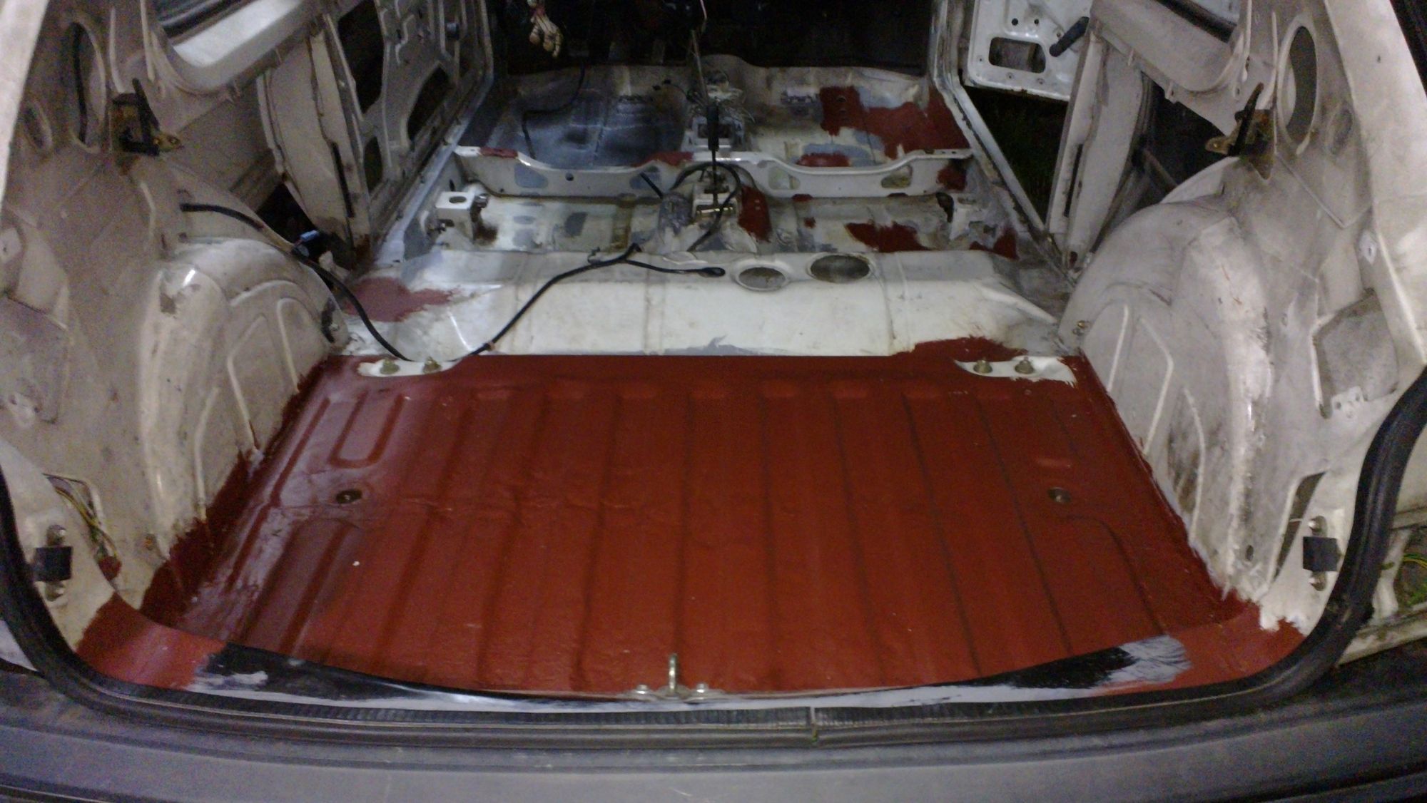 - No i zaspawałem też dziurę nad zbiornikiem paliwa, a przy okazji wyszło, że pod tą właśnie dziurą jest wzmocnienie idące do połowy podłogi bagażnika. Dorobiłem taki szkielecik, i obspawałem blachą, potem zaspawałem dziurę i przyspawałem otworowo do tego wzmocnienia,, a potem jeszcze obspawałem od spodu. Mam nadzieję, że będzię się trzymać;