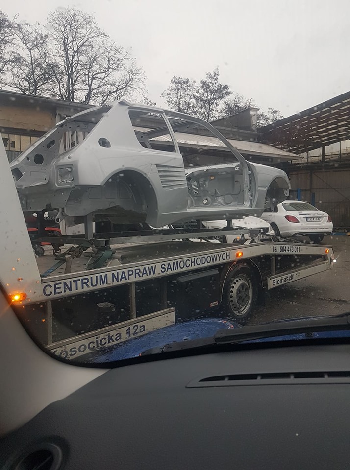 Na samochodzie są już drzwi, wszystkie szyby, klapa tylna ze spojlerem, lampy tylne. Zamontowany został szyberdach.