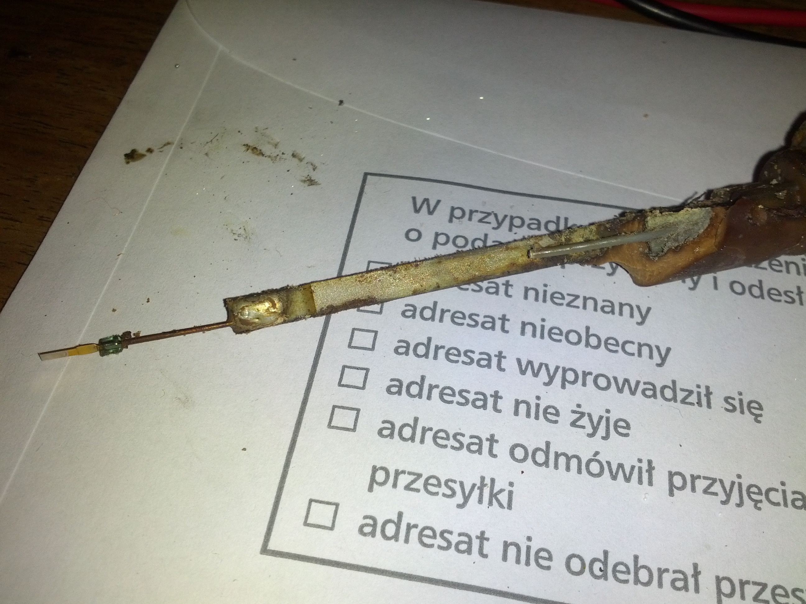 następnie odginamy - w moim przypadku łamiąc - wąsy po obu stronach u góry /nie te co poprzednio, dam foty będzie widać/ trzymające wtyk i cały czujnik w rurce obudowy.