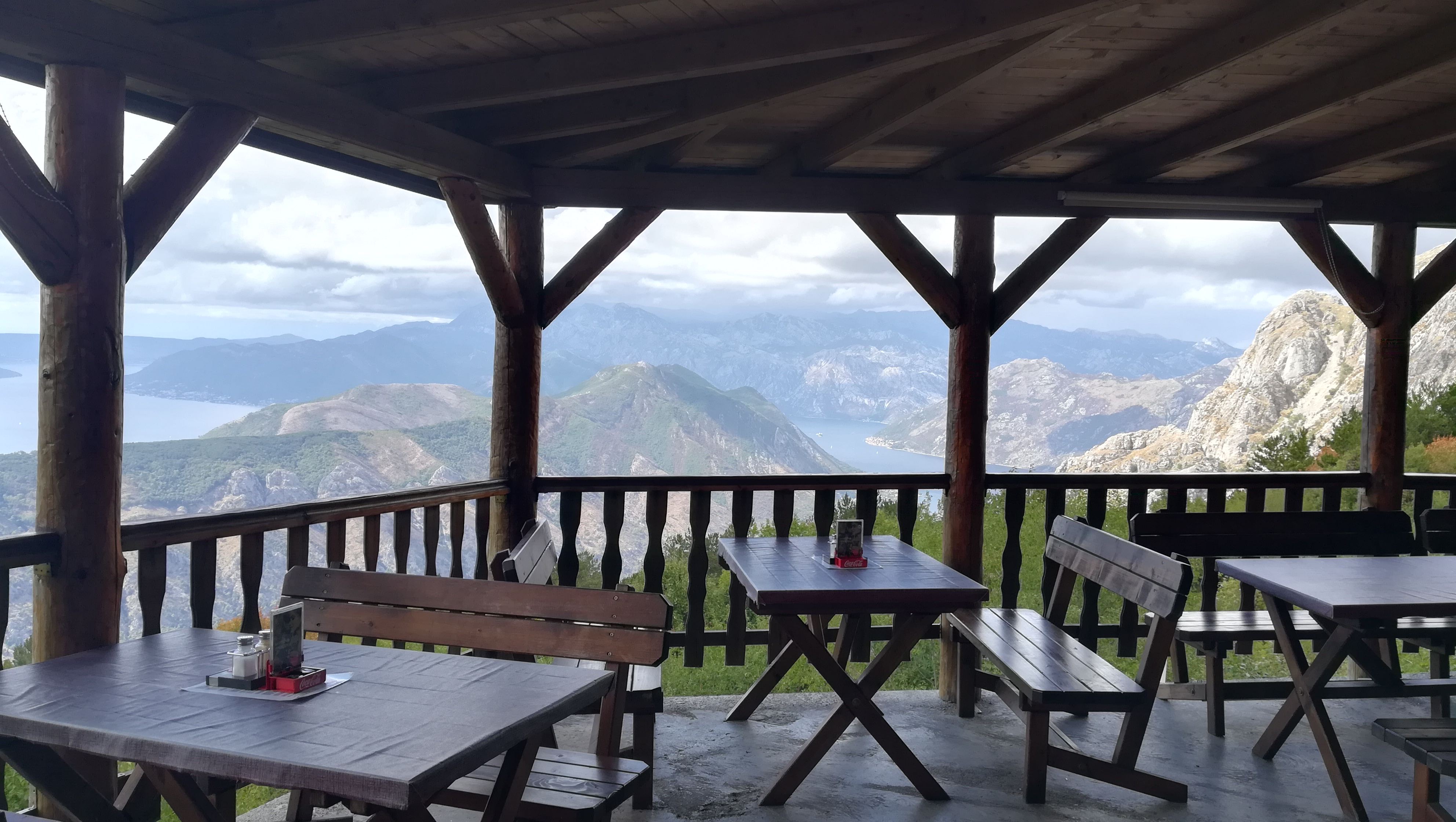 Donji Stoliv - Serpentyny Kotorskie - Lovcen - Veslo ok.130km Naszym dzisiejszym celem jest Narodowy Park Lovcen, do którego z zatoki Kotorskiej prowadzi taka droga Dla ostudzenia emocji po takiej "spirali" można zasiąść przy kawie w takiej oto kawiarni Chętni do ponownego przejazdu serpentynami mogą w tym czasie "korzystać do woli" aż do kompletnego upalenia sprzęgieł i klocków oraz ugotowania silnika