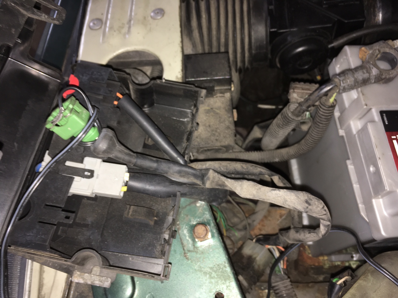 Wolna wtyczka w okolicy reflektora, w dodatku zielona - ma tylko jeden pin. Była schowana w czarnej puszce przekręconej do pasa przedniego: