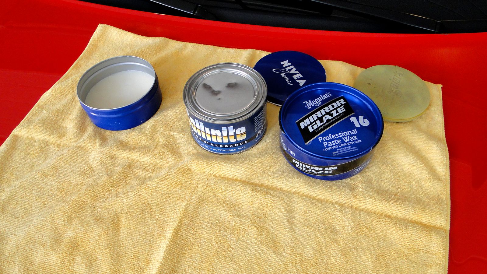 porownanie woskow: od lewej Collinite 476 (opakowanie zastepcze), Collinite 915, Meguiars #16