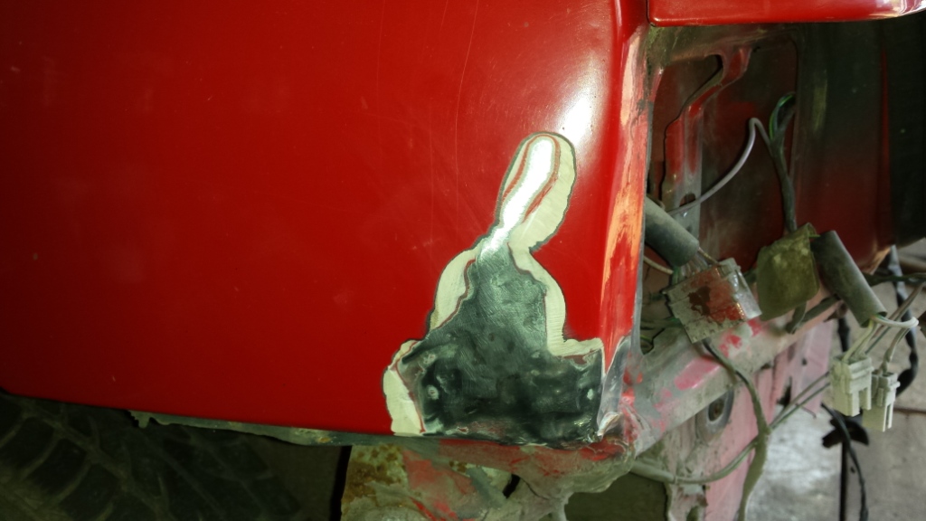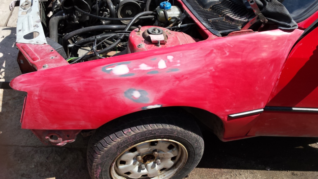 Lewy błotnik i maska miały delikatnie inny odcień. Dodatkowo maska od środka miała kolor zielony. Zostały pomalowane i delikatne zaprawki.