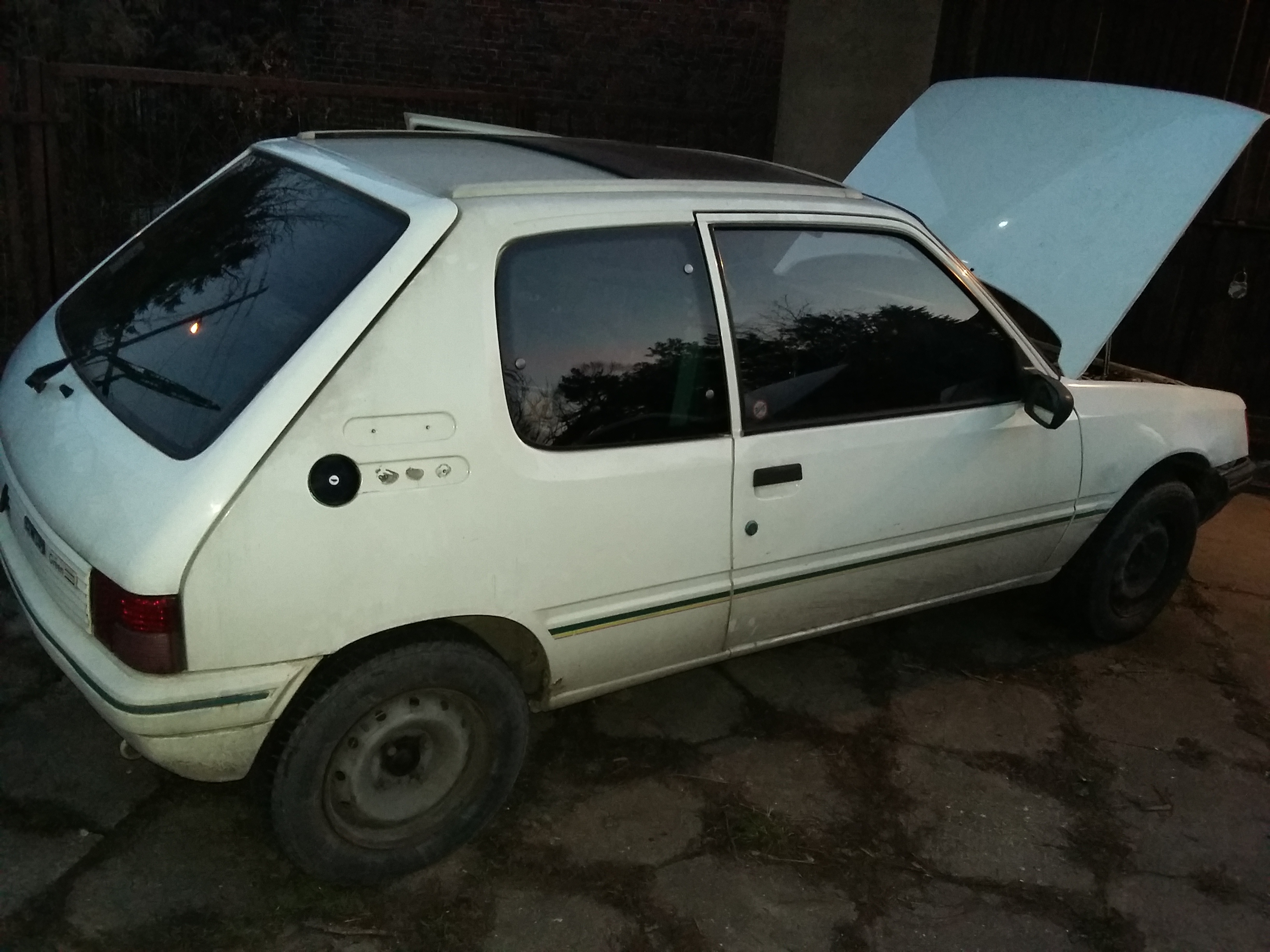 Po długim zastanowieniu, nudzie w sobotni poranek w pracy i wygrzebaniu znikomych fot mojego niedawnego nabytku (jest ich mało bo uważam że jeszcze nie jest sie czym chwalić:p) postanowiłem pokazać moją 205 w dieslu. Po sprzedaży mojego poprzedniego daily (ori Golfa 2 gti 16V) przyszedł czas na poszukiwanie czegoś co powinno być z założenia niedrogie w użytkowaniu...po obejrzeniu jakiś 15 samochodów które okaząły się blacharsko słabizną przyszedł czas na peugetoa. podkreślę że nie szukałem konkretnie auta z pod znaku lwa:) Historia samochodu dość ciekawa ponieważ miał tylko dwóch właściceli, kupiony w Łódzki salonie w 91 roku przez starszą panią po czym odsprzedany 10 lat temu sąsiadowi który zakupił go dla córki. Wszystkie dokumenty typu książki itp, przebieg 150 tys km. Maska do wymiany ponieważ jakis stolarz ją rzeźbił na rancie po delikatnej przygodzie. Generalnie samochód cąły w ori bez kolizji prócz wspomnianego rantu maski. Zawieszenie z przodu wesoło sobie postukuje(już nad tym pracuje i zbieram fanty), odzywa się podpora półosi, miał przepalony wydech (juz wymienione), automat od ssania( nowy) i jeszcze patu innych o których pewnie zapomniałem wspomnieć. Dokupiłem do niego tydzień później dawce maski i paru gratów czyli green'a. Generalnie plan jest przywrócić autko do stanu godnego użytkowania + korekta i cycek oraz jakieś koło i pewnie parę drobiazgów