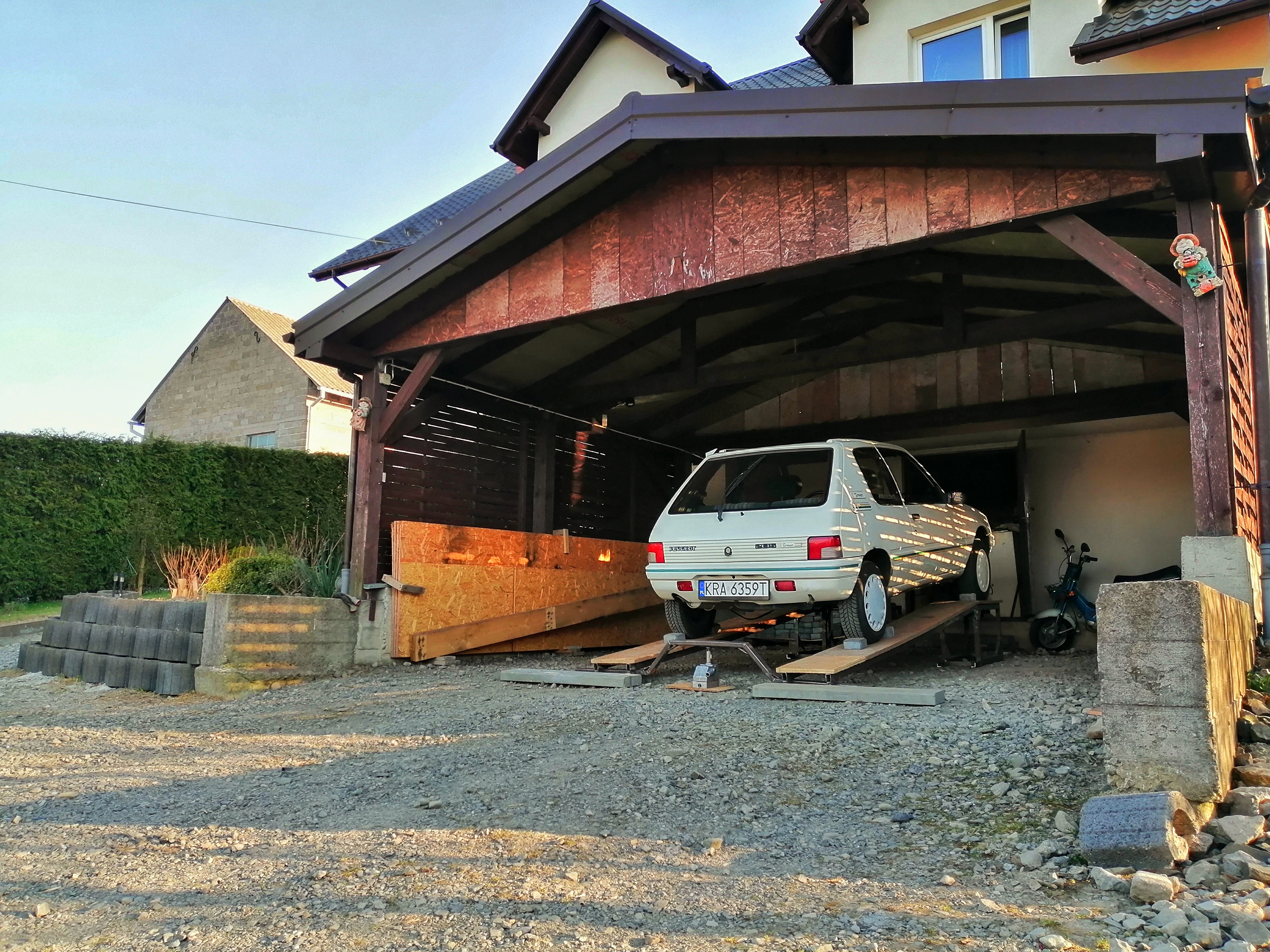 Prace przy 205 cały czas trwają. W planach miałem wymienienie wszystkich płynów, żeby było łatwiej zbudowałem najazd, teraz Peugeot stoi 50 cm nad ziemią i można wygodnie pod nim pracować. Muszę się teraz zająć wyciekiem (prawdopodobnie że skrzyni biegów) ale cała skrzynia i okolice są zachlapane olejem, także będzie mycie silnika i jeśli się okaże że to skrzynia to czeka mnie wyciąganie skrzyni biegów i jej uszczelnienie. Przy okazji wymiana poduszki za silnikiem (w mocowaniu gdzie przechodzi dłuższa półoś) ponieważ auto przy przyspieszaniu bardzo się kołysze i stuka przy ruszaniu, silnik ma duży luz przód tył.
