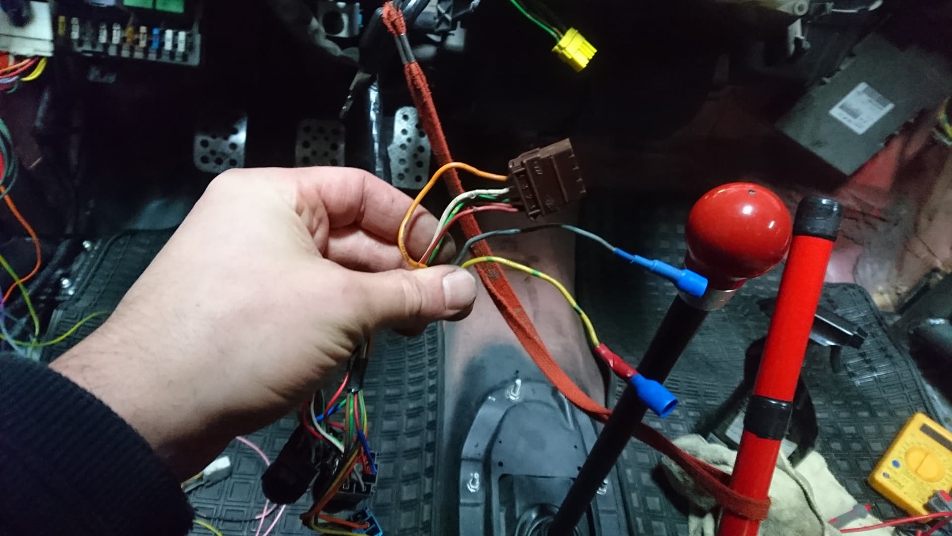 To jest kawałek wiązki idący do konsoli środkowej, do brązowej kostki chyba była podpięta wiązka idąca do zegarka itd, którą wywaliłem - może tak zostać? Żółty i niebieski kabel na foto w termokurczkach to dwa kable od zasilania zapalniczki z którego miałem zrobione zasilanie ładowarki USB. Po podpięciu miernika do tych dwóch kabli zasilania jest brak