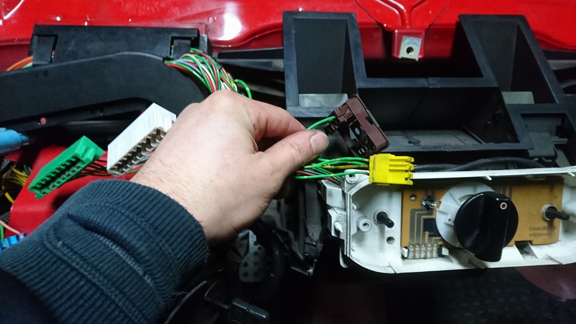 Brązowa kostka jest jakimś punktem zbiorczym? To jest przykręcone od spodu do deski rozdzielczej, na masę to to nie wygląda. Po odpięciu tego na początku nie było podświetlenia panelu sterującego nawiewem. Obecnie w żadnej sytuacji nie ma takiego podświetlenia...
