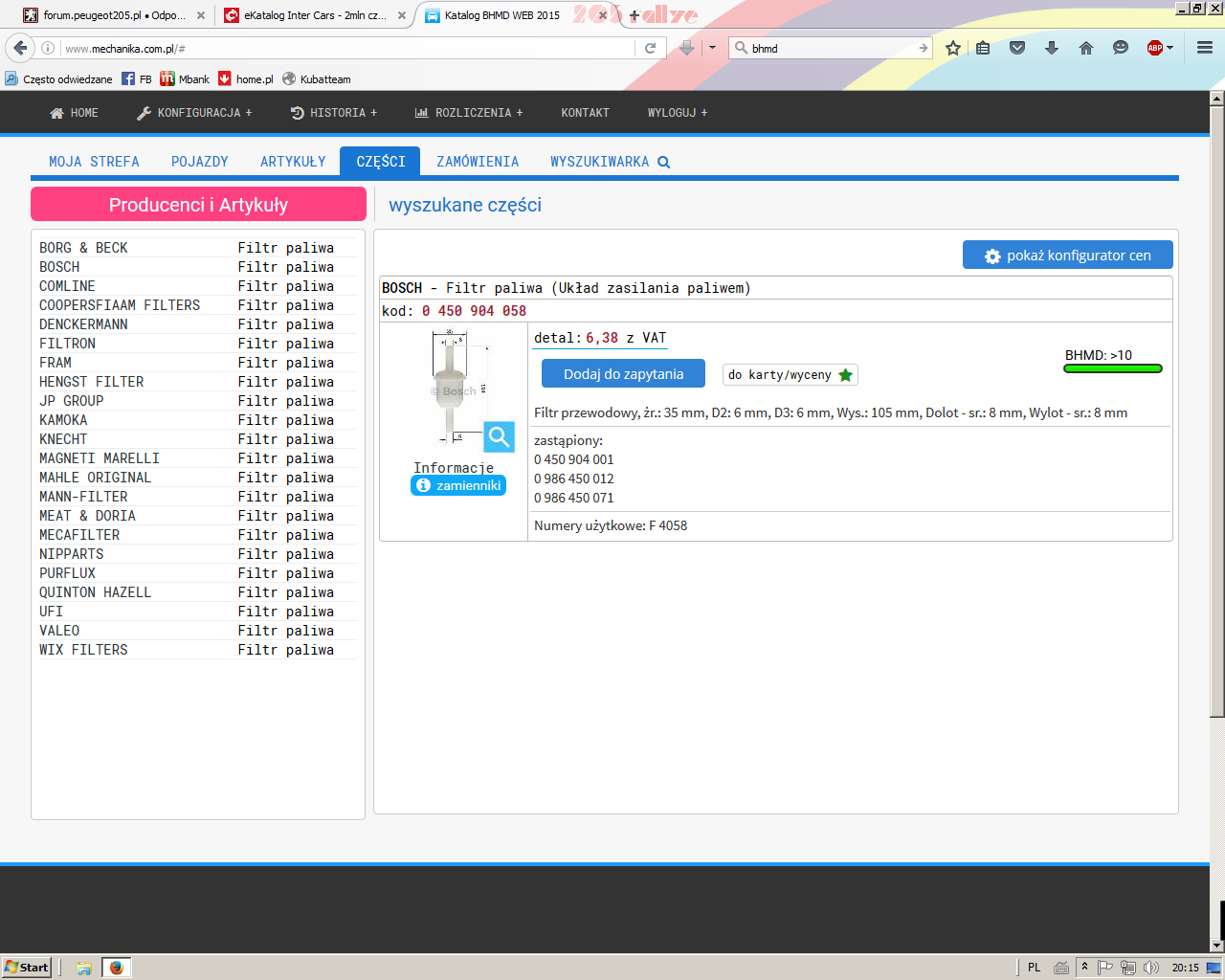 Dzięki, ale w tych katalogach hurtowni motoryzacyjnych z tego co widzę są takie same filtry jak w zwykłych sklepach internetowych - czyli kompletnie inne od tego co jest u mnie (u mnie przewody paliwowe są z boku filtra, nie na górze i na dole). Zmiana kryteriów wyszukiwania na 1.0 niestety też nic nie dała.