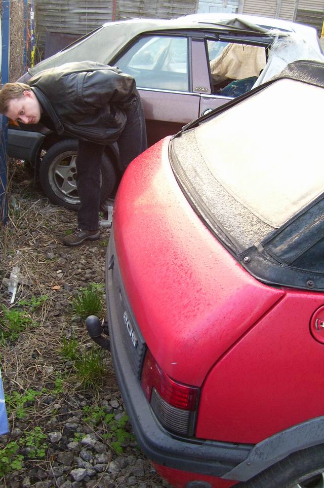 I co się okazało? Warto było! Po przeczesaniu placu wypełnionego odpicowanymi na sprzedaż Audi A4 i Fordami Mondeo dotarliśmy za drewnianą budę, gdzie ujrzeliśmy... CTI jakie jest każdy widzi. Postanowiłem zajrzeć do środka, jako że Pug był otwarty, a w stacyjce tkwiły kluczyki. Tapicerka prezentowała się całkiem nieźle. Na tylnej kanapie dostrzegłem ciekawy detal. Czy Wy też to widzicie? No, ale przecież tapicerka nie jeździ. Postanowiliśmy dokonać oględzin budy... Lubomir zakasał rękawy i wytężył wzrok Aby po chwili stwierdzić, że tym CTI można ciągnąć jacht. Poza tym brakuje mu dokładki CTI, znaczka, a poszerzenia i plasticzki Pininfarina przytwierdzone są na zardzewiałych śrubach. Rzut oka pod maskę. Rozpórka prawie jak ta Robsonowa z Praktikera. Brak akumulatora i numerów nadwozia. Jest za to tabliczka zastępcza. Jeszcze ujęcie wnętrza z innej strony. Sądząc po kształcie fotela, tym autem jeździł kiedyś jakiś zawodnik sumo. Fotka na odchodne. Zwróćcie uwagę na auto po prawej stronie - oryginalny Fiat Ritmo Cabrio przywieziony ze Szwajcarii. Szkoda tylko, że nikomu nie chciało się go przykryć plandeką i trochę sobie zgnił w środku... Udało nam się pogadać z kimś, kto zna właściciela czerwonego 205 CTI. Gdy usłyszeliśmy cenę, stwierdziliśmy zgodnie, że te pieniądze lepiej wydać na Forda Thunderbirda, który też wpadł nam w oko. Uff, to tyle. Miłego oglądania.
