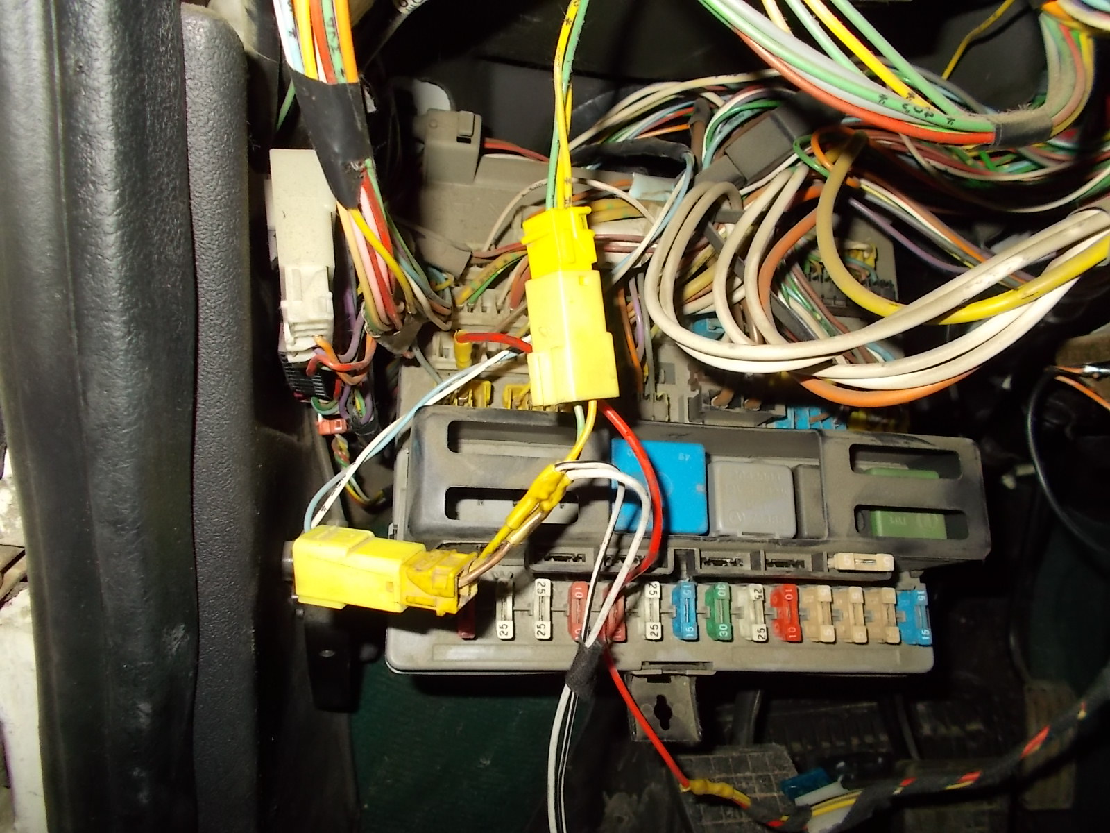Osobiście zamontowałem ją z prawej strony kolumny kierownicy pod brzęczykiem świateł. Polecam przymocować ją na trytki, żeby nie latała. Masę do centralki najłatwiej podpiąć pod nakrętkę kolumny kierowniczej. W tym celu warto zarobić na końcu kabelka konektor oczko 8mm i przykręcić nakrętką kolumny. Plus najłatwiej wyprowadzić ze skrzynki bezpieczników. W lewym dolnym rogu jest wolne miejsce na kostkę 3 pinową. Na środkowym pinie jest stałe +12V, czyli to co potrzebne. Osobiście do podłączenia użyłem oryginalnej kostki i przylutowałem do niej kabelek z centralki. Równie dobrze można użyć zwykłego konektora żeńskiego 6,3mm. Kolejny etap to podłączenie sterowania siłownikami. Po lewej stronie deski, nad skrzynką trzeba poszukać dwu-pinowej żółtej kostki. Z jednej strony ma kabelki biały i niebieski, a z drugiej żółty i zielony. Jest to kostka łącząca instalację siłowników drzwi z siłownikiem tylnej klapy.
