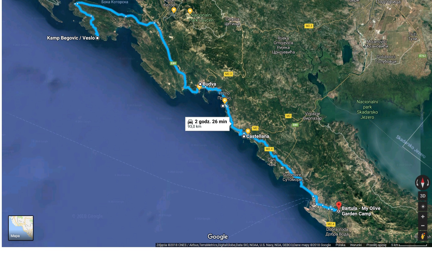 Ze szczytu rozpościera się piękny widok na park, a także na Zatokę Kotorską. Po nacieszeniu się widokami czas wracać w dół aż do poziomu morza. Jedziemy w stronę półwyspu przy przesmyku prowadzącym do zatoki kotorskiej na którym znajduje się urokliwy camping Kamp Begovic Tutaj proponuje pozostać na dwie noce, ze względu na panujący tam spokój i piękną plażę na której można poskakać do wody i zażywać do woli kąpieli słonecznej
